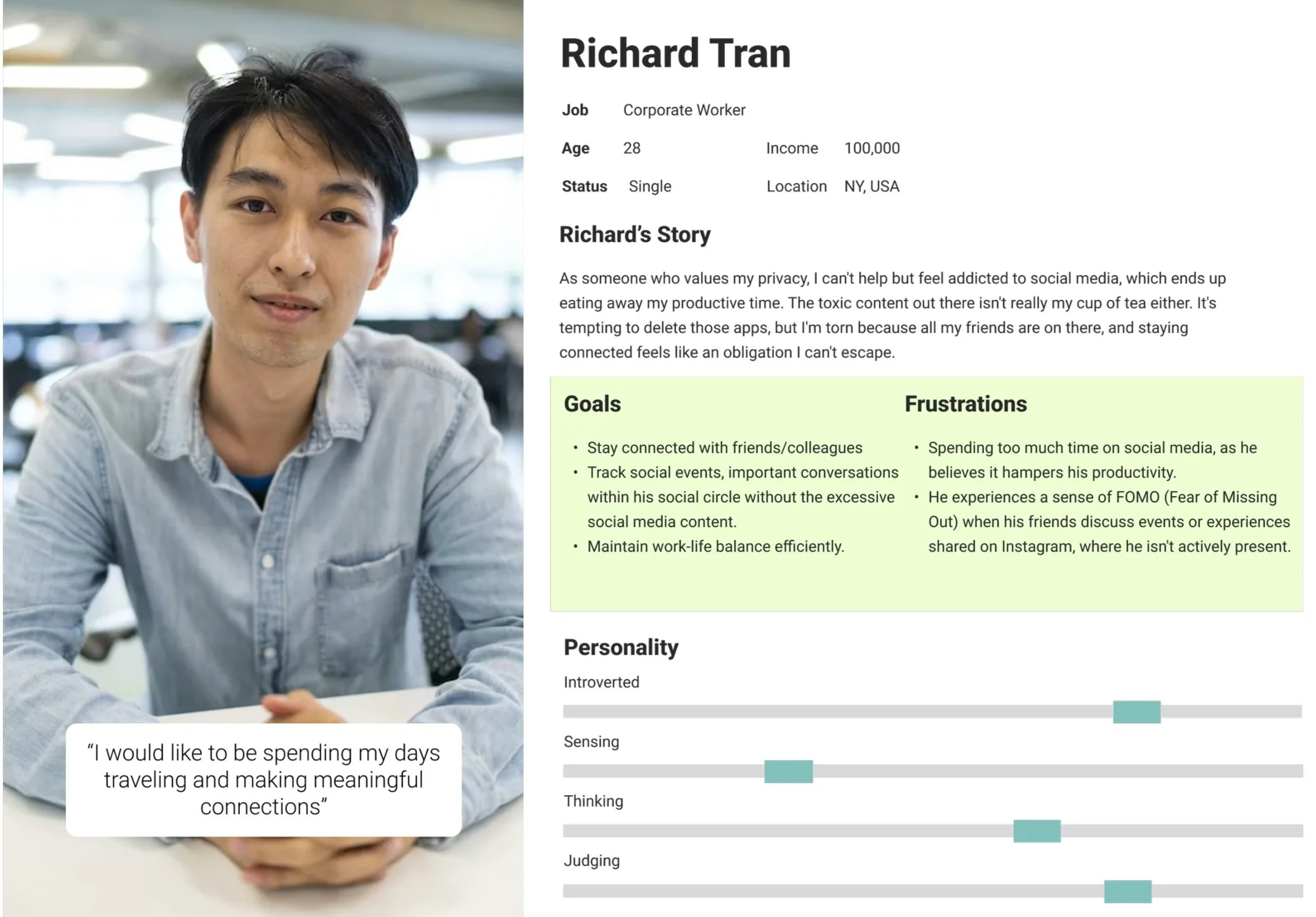 I selected this persona to represent the typical working individual seeking to boost productivity while maintaining connections with friends. The aim is to provide a platform free from distractions like doom scrolling and ads, catering to those who value both efficiency and meaningful social interactions.