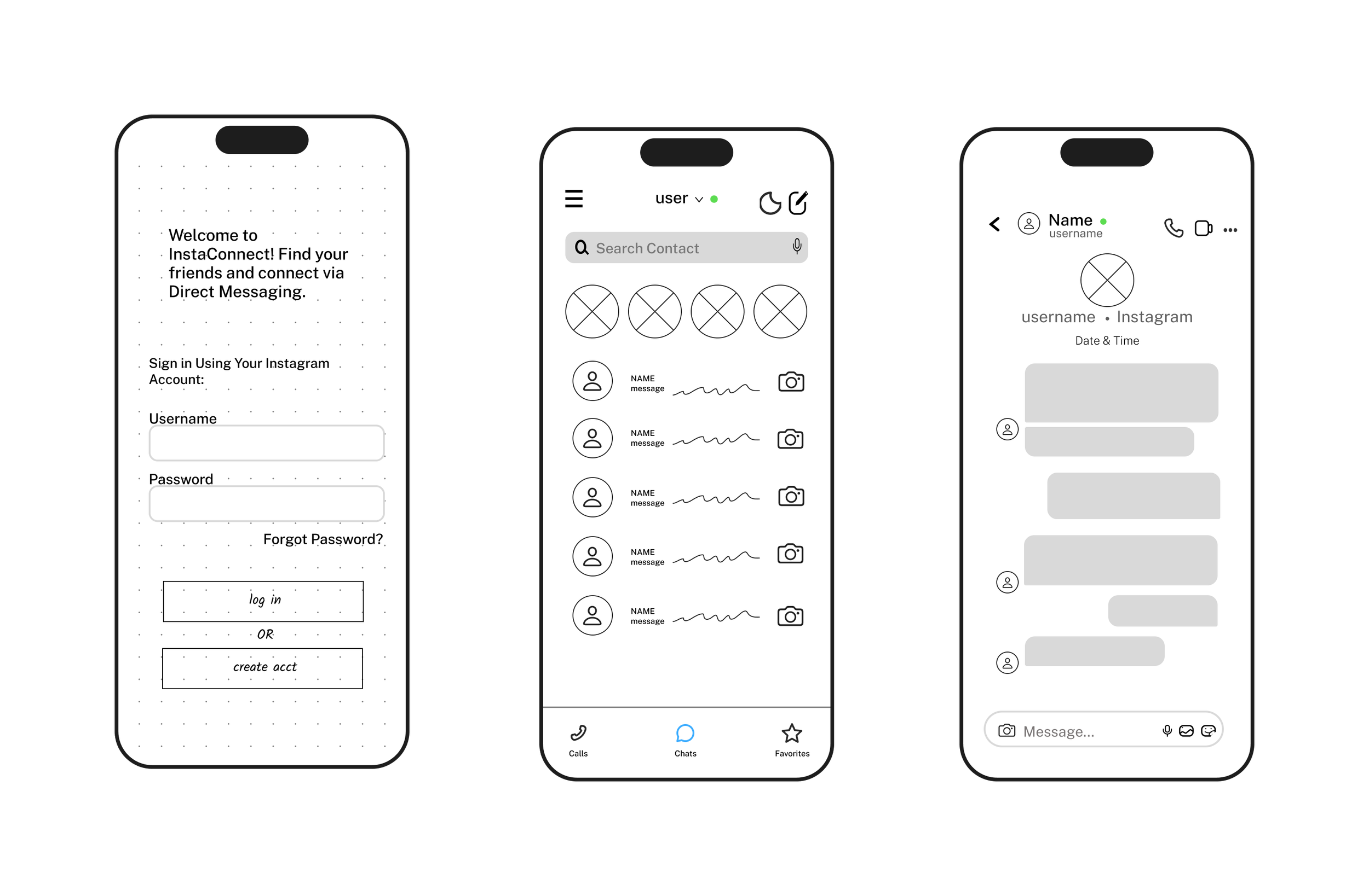 home pagemessagingmessagingI created simple wireframe sketches that resemble Instagram's direct messaging to highlight the app's ease of use.
