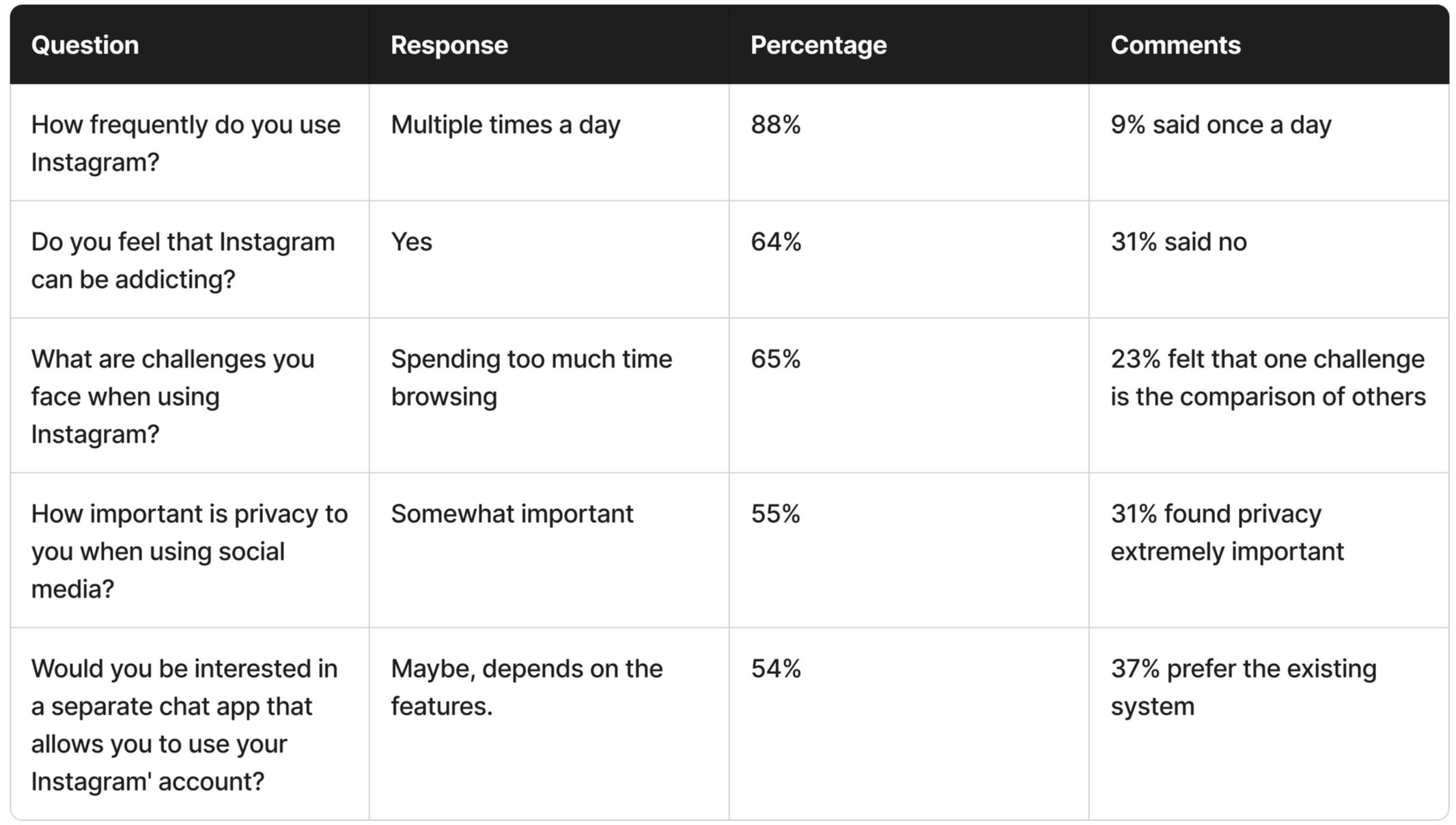 Active Instagram users feel addicted to excessive scrolling, varying privacy importance. Interest in integrated chat app for private communication with desired features alongside current messaging system.