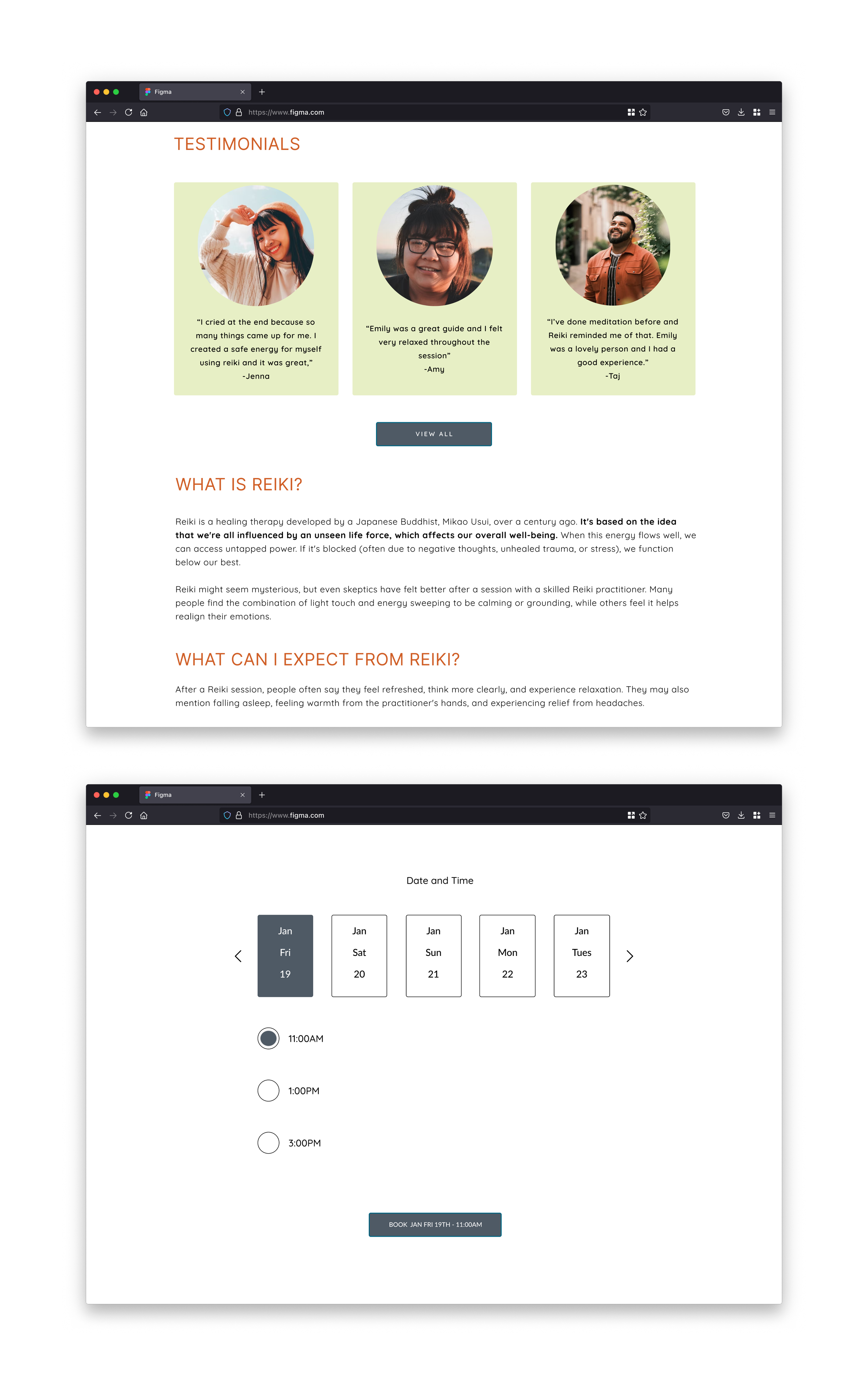 I would expect to find some information about what Reiki is and what it does, what a session includes. I would also expect to find more about the practitioner or Reiki master's background. Definitely links to be able to book sessions and work calls, to learn more about consultation calls, maybe if necessary. And yeah, maybe a frequently asked questions page, contact form, testimonials reviews on that specific practitioner.